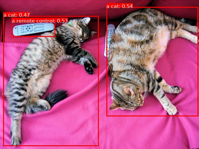 上述脚本实现了一个零样本目标检测示例:加载 llmdet_tiny 模型,对输入图像中的“a cat”和“a remote control”进行检测,输出检测框、类别与置信度,并生成可视化结果。