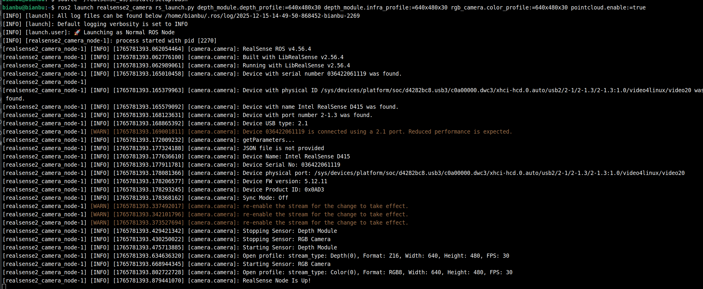 ros2 launch realsense2_camera rs_launch.py depth_module.depth_profile:=640x480x30 depth_module.infra_profile:=640x480x30 rgb_camera.color_profile:=640x480x30 pointcloud.enable:=true