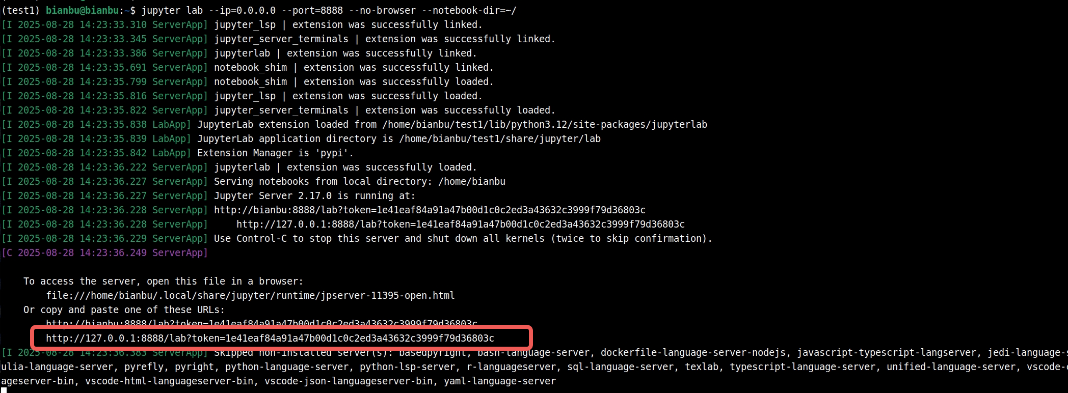 将 http://127.0.0.1:8888/lab?token=1e41eaf84a91a47b00d1c0c2ed3a43632c3999f79d36803c 这一段复制并保存到你的记事本。这里 token 后面的数字会有变化,请复制你自己终端打印的,而不是本文的。