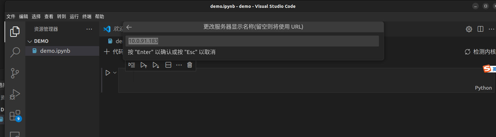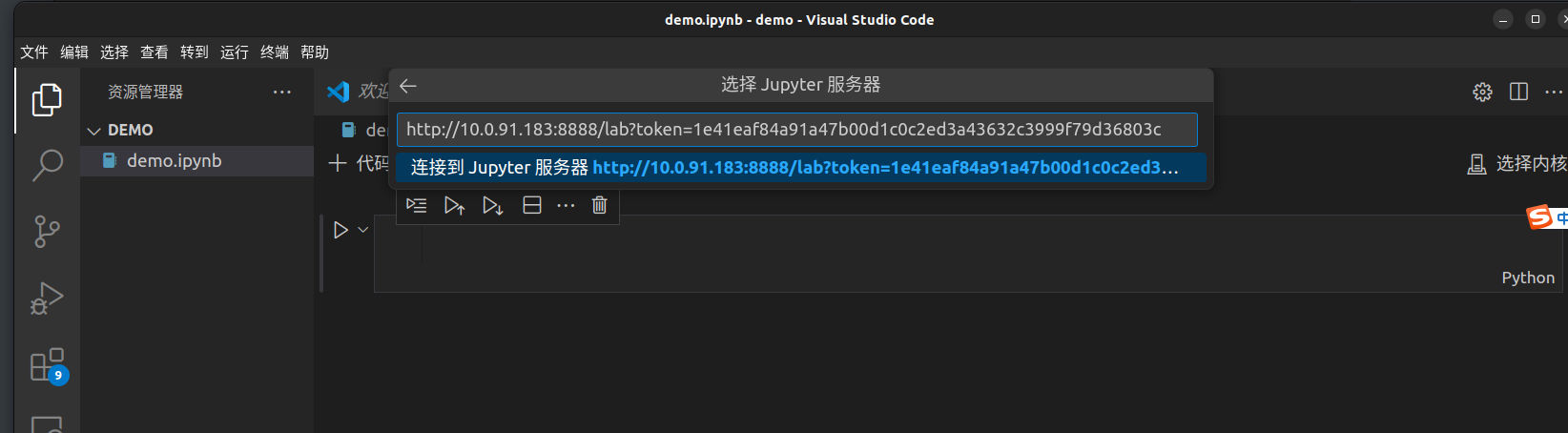 点击 “选择内核”,选择 “现有 Jupyter 服务器” 粘贴我们刚才保存的链接,如下