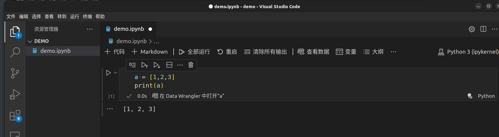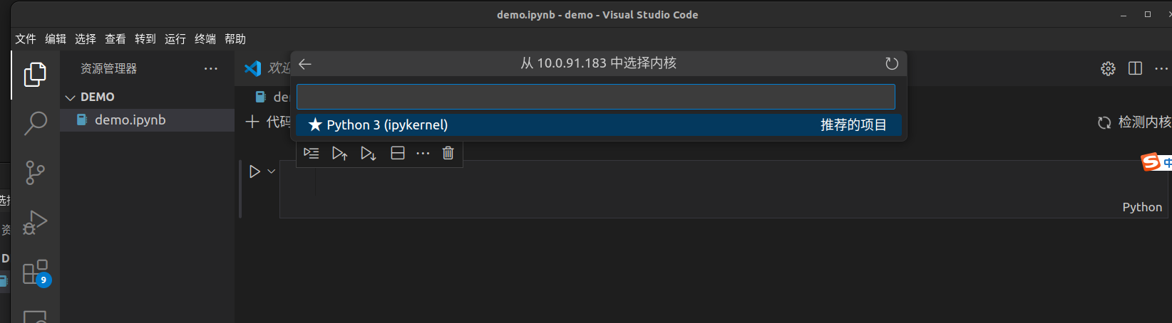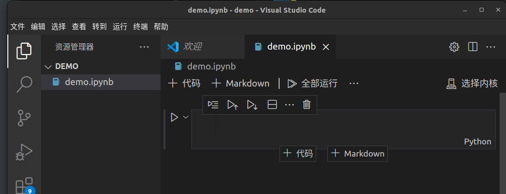 使用 VSCode 打开一个空白文件夹,新建一个 demo.ipynb 文件,如下: