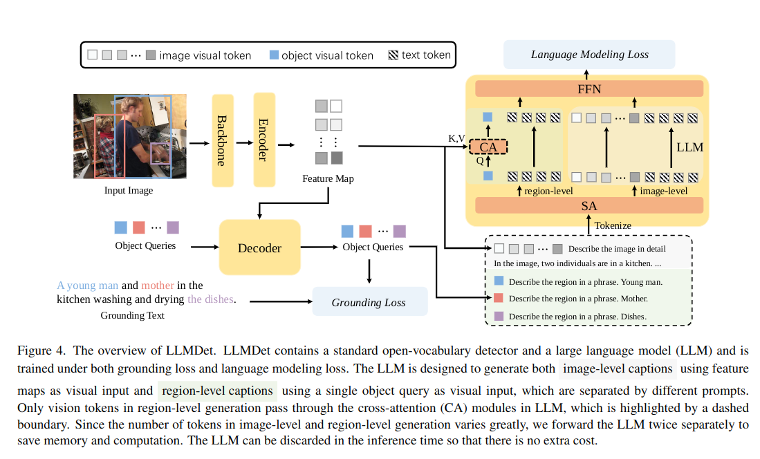 - 大语言模型(LLM):作为语言生成组件,通过交叉注意力(Cross-Attention, CA) 接收视觉标记,在训练过程中生成图像及区域描述,从而将语义信息注入视觉特征中。