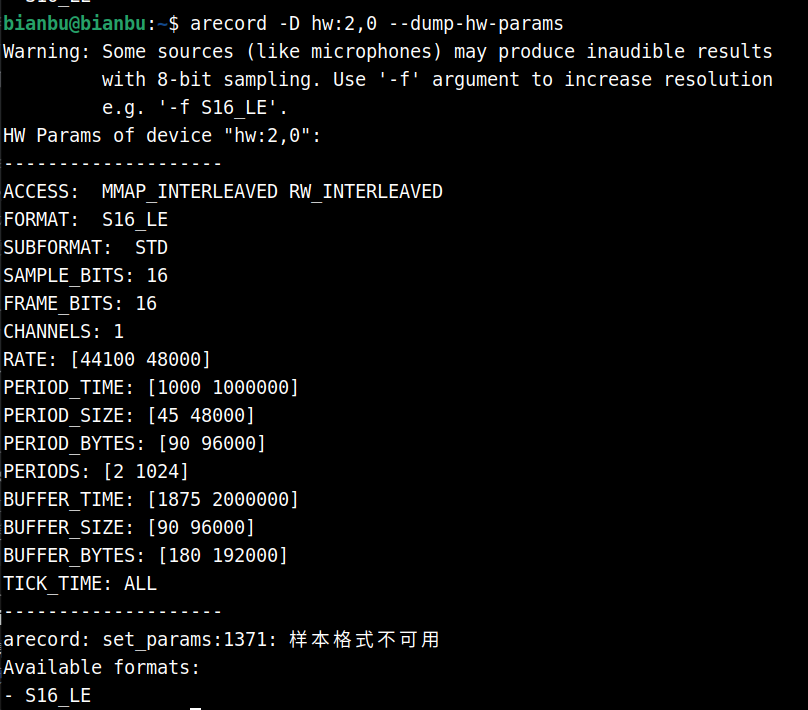 FORMAT: S16_LE # S16_LE:16 位有符号整型,小端字节序(常用)。