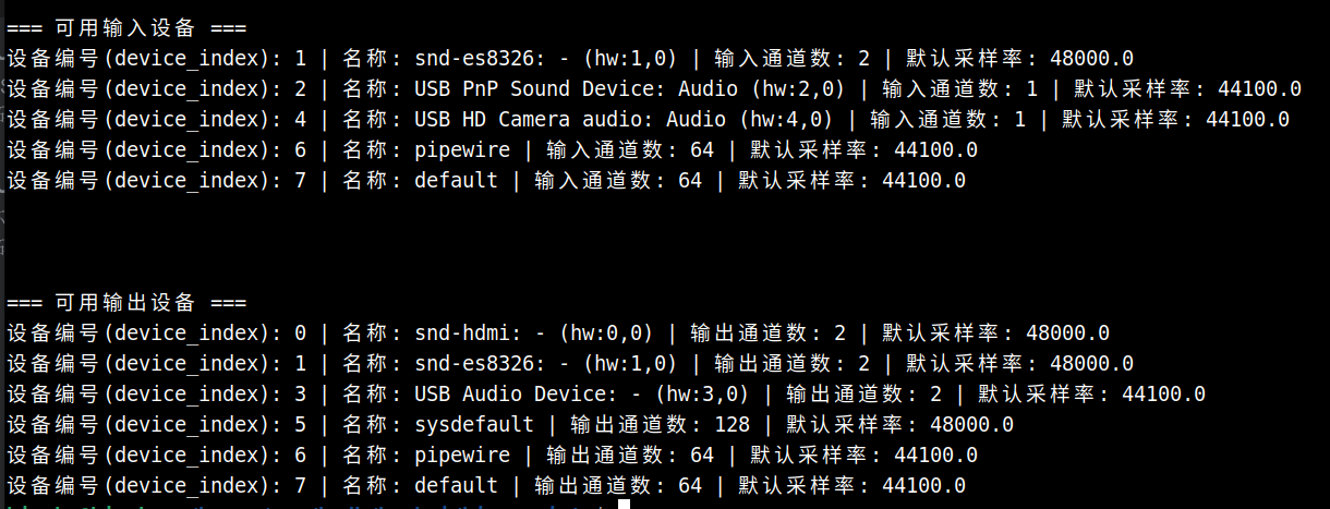 device_index为 2 的是这里的 USB 麦克风(可以插拔设备对比确认)- 完整设备号为 hw:2,0