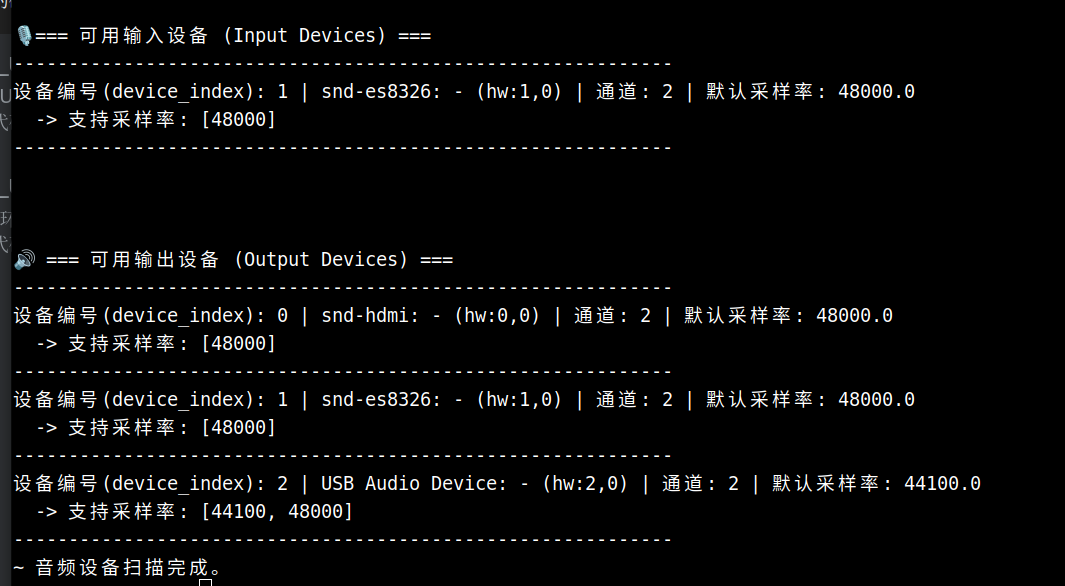 device_index为 2 的是这里的 USB 扬声器(可以插拔设备对比确认)- 完整设备号为 hw:2,0