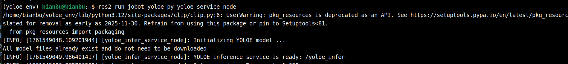 推理服务接受原始图像消息和文本提示并返回 YOLOE 推理结果,可以通过 ros2 interface show jobot_interfaces/srv/YOLOEInfer 查看服务定义。