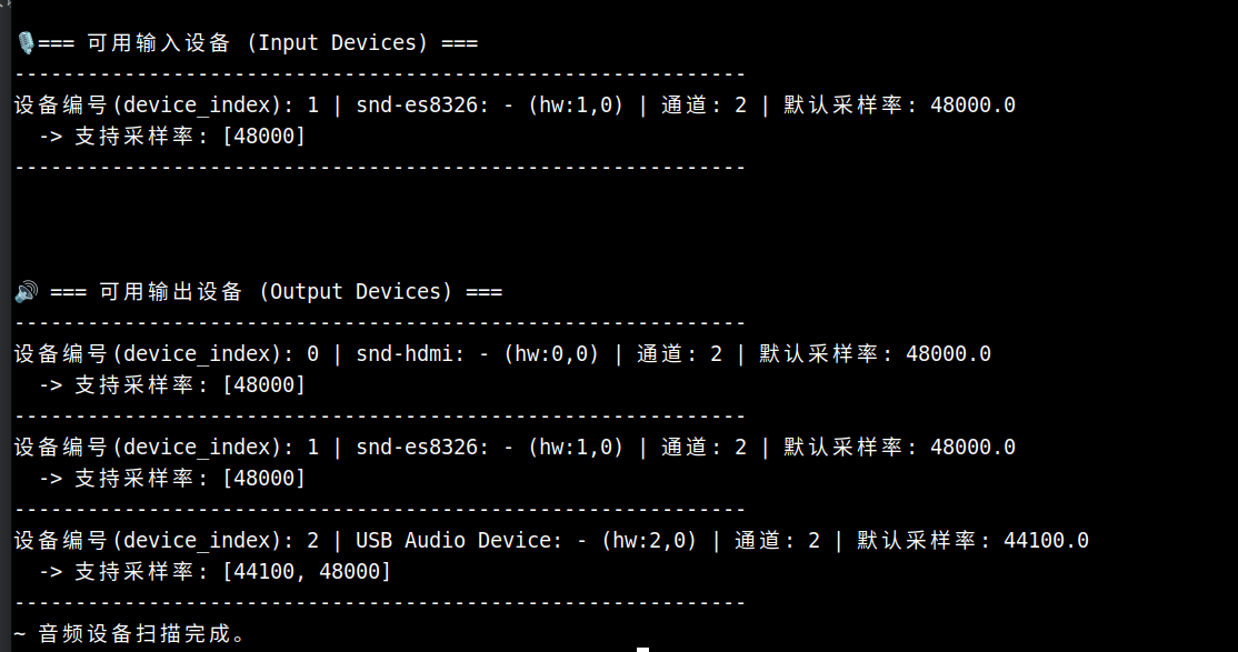 - 输出设备中 USB Audio Device 为 USB 声卡接口,提供标准双通道(立体声)播放能力,支持 44.1kHz 与 48kHz 两种常用采样率。